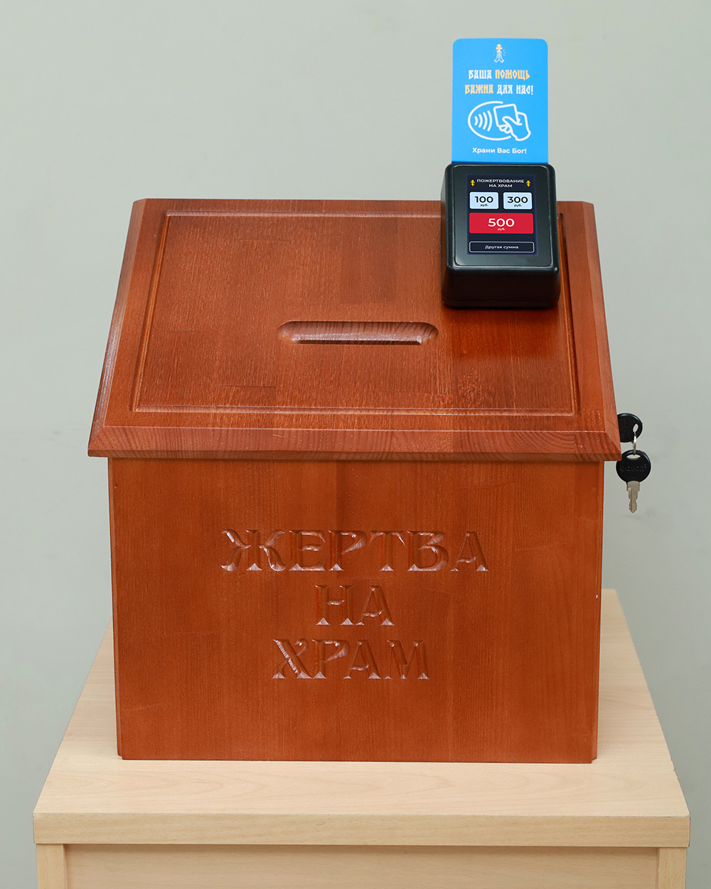 Терминал, размещенный на привычном ящике для пожертвований, стимулирует прихожан к более щедрым пожертвованиям за счет удобного сочетания способов платежа.
